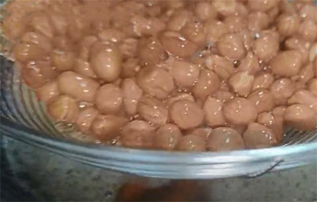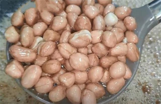 5.五分钟之后我们继续开火,用油浸泡过的花生米,表皮看起来非常的透亮,然后继续开中小火,慢慢的给它轻炸,又炸了2分钟之后,我们用勺子舀起来,听见哗啦哗啦的声音,像这样就说明好了,然后给它关火,放在这里再浸泡20秒,我们用这种方法炸出来的花生米非常的透,不干不糊,吃起来一点都不涩嘴,颜色也非常的漂亮,20秒之后,我们用笊篱迅速把它捞出控油。