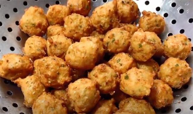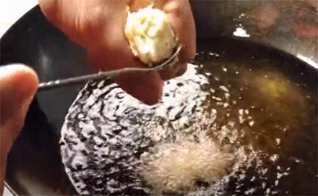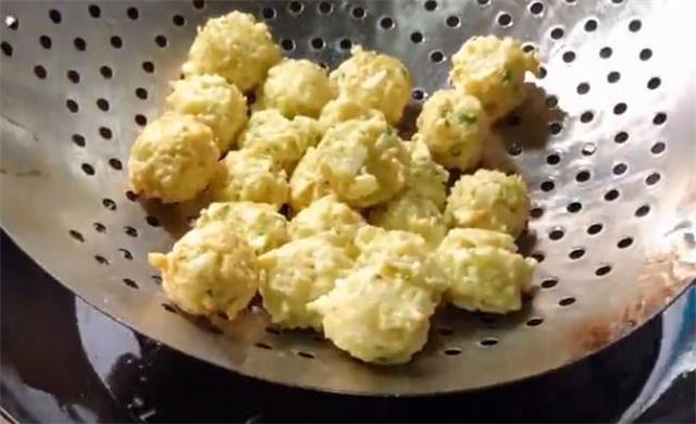 11.然后再继续用同样的方法下入锅中,下完后先静置五六秒钟,待定型后用勺子推散,再倒入提前炸过的一起炸制。这时候火可以稍微开大一点,保持中火炸制2分钟左右,把丸子都炸至漂浮在油面,这时候已经有八成熟,然后捞出来。