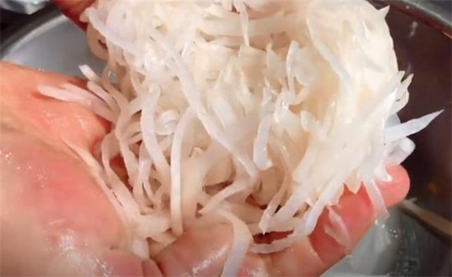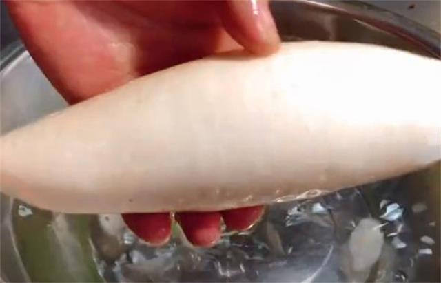 1.首先准备白萝卜,一根一斤左右,我们这儿才八毛钱一斤,你们那儿多少钱一斤呢?倒入清水清洗干净,萝卜头的位置不好清洗干净,影响口感和颜色,切掉不要,萝卜尾巴也去掉不要,然后把表面这些根须用刀削干净就可以了,不用去皮,带着萝卜皮吃,不管是口感和营养都非常的不错,削成这样就可以了,然后拿出控干水分。