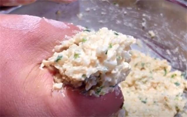 9.然后把火关小一点,用手的虎口像这样慢慢的挤出丸子,放入锅中。