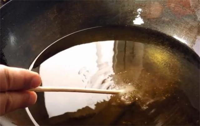 8.准备好后,接下来开始炸制,起锅先把锅烧干,然后倒入植物油,油温烧至5成热,放一根筷子,周围很快的冒密集的小泡,这个油温就可以了。