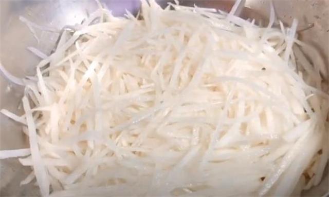 2.接下来改刀,先斜刀切成薄薄的厚片,稍微薄一点,如果嫌麻烦的,也可用擦板擦成细丝,不过这样切的吃着口感更好一点,在摆码整齐切成粗细均匀的细丝,切好后装入一个比较大的盆中,放入食盐大概20克,然后用手抓拌均匀,这个目的是杀出萝卜里边多余的水分和芥辣味。
