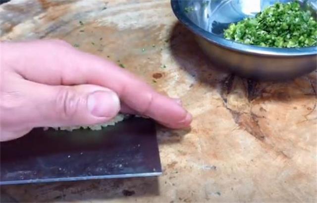 6.挤干水分后,再放在案板上,接着用刀剁碎,这样捏出的丸子成型更好,新手也能够很好的学会,切碎后稍微再剁一下,成这样的小颗粒就可以了。
