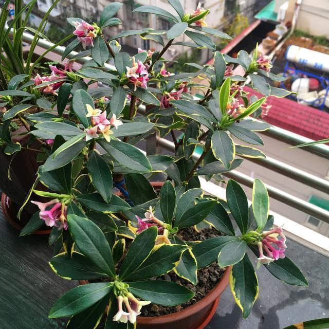 7、瑞香 瑞香是一种非常好闻的花卉,深受人们的喜爱,我这株金边瑞香已经有四年时间了,每次开花都能引来一群宠物的围观。 养瑞香不需什么技巧,只需土质疏松、光照好、通风好、施些肥料,就可以让它散发出迷人的香气。瑞香盆景每天都能得到直射的太阳,但切记不能长时间被雨淋湿,因为它非常怕水。