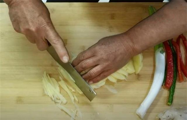 1.做土豆丝的食材很简单,土豆一个,配上大葱,老姜,还有几根小辣椒,就能做一道酸辣爽口的土豆丝,土豆丝切成片,然后改刀切成细丝,越细越好,土豆丝切好备用。