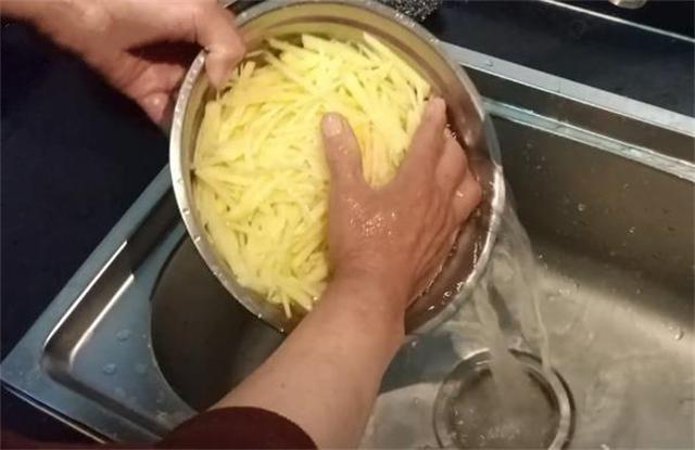 3.接下来我们给土豆丝洗干净,把它本身带的淀粉全部清洗掉,洗好之后把水尽可能的全部都倒掉。