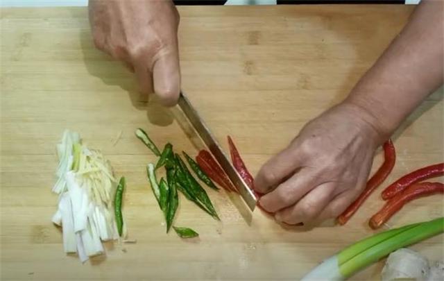 2.大葱侧切成条,姜切片,青红辣椒也侧切成条,把它们放到容器里备用,记得再准备一些花椒。