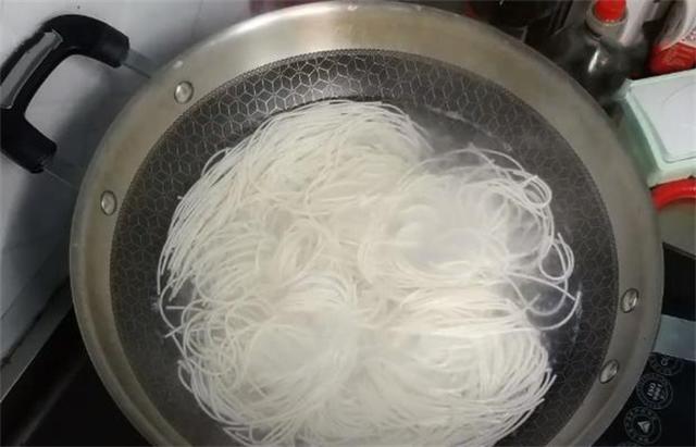 5.到了该煮面的时候了,锅内烧水,等水冒着小气泡的时候,加入龙须面,等水沸腾了,翻滚了盛出即可。