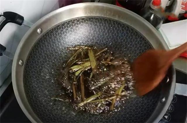 4.现在我们开始制作葱油,锅内热油,把切好的葱段丢进去,用中小火慢慢熬,熬到这个泛着焦黄的颜色就差不多了,熬好之后把调制好的料汁倒进去,搅和搅和,等水沸腾后盛出。