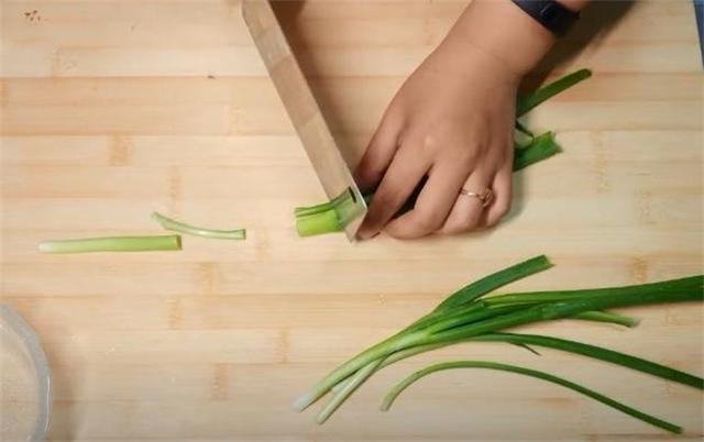 2.小葱洗净,只保留绿色的叶子部分,空白部分切掉,不要切成长段,你喜欢长的就可以切的长一点,备用。