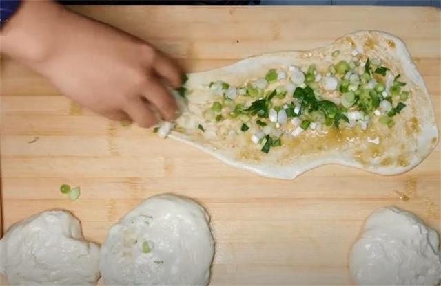 5.油酥涂抹前搅一搅,撒到面饼上,再来点葱花,从末端一拉一扯扯成小剂子,按照这个方法多做几个。