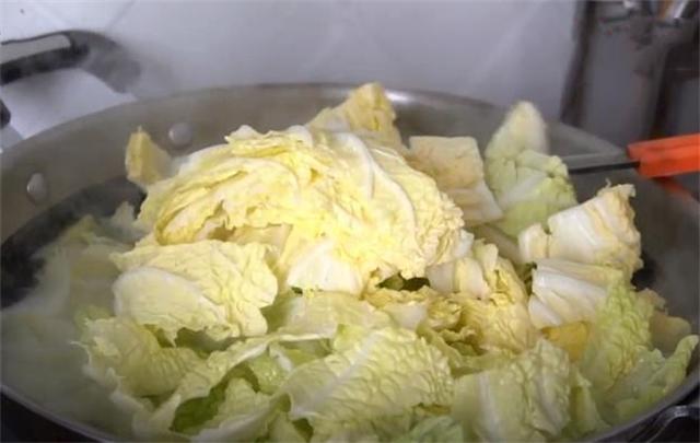 2.锅内倒入适量冷水,我们先把难熟的白菜帮放进去煮一下,现在水开了,咱们再把白菜叶放进去一起煮,等到水再次开的时候,再把白菜沥干水分捞出来就行了。