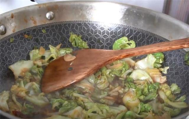 4.锅内倒入适量食用油,现在油热了,我们把葱蒜干辣椒段放进去,煸炒出香味后,再把卷心菜倒进去,盖上锅盖焖上三四分钟,现在可以看到卷心菜已经稍微变软了,我们加入适量生抽,再来一勺盐,然后放一勺糖给它翻炒均匀,最后再来点素蚝油,翻炒均匀后就可以出锅了。