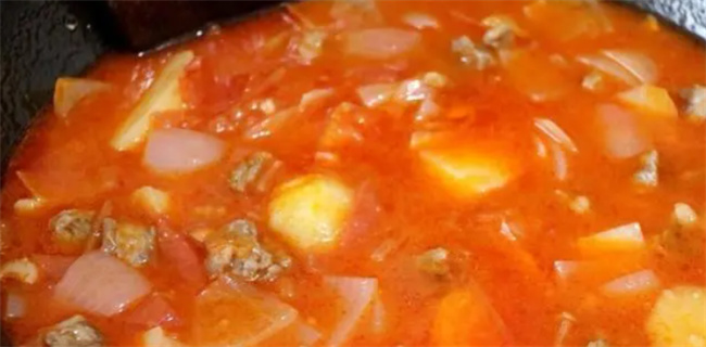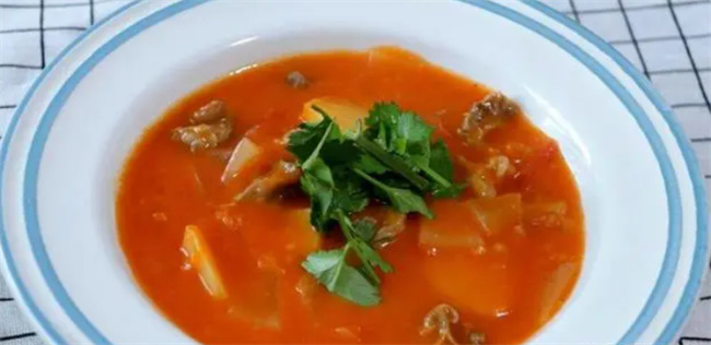 四、懒人罗宋汤 食材: 牛肉、土豆、洋葱、番茄、香菜、面粉、番茄酱、黑胡椒粉、盐 制作方法: 1. 牛肉切块,焯水后清洗,加入姜片、盐焯水,捞出备用。 2. 西红柿切块,不用去皮;土豆、洋葱切块。 3. 牛肉加入姜片、盐再次焯水,煮至软烂。 4. 热锅加入油,炒熟西红柿制成酱汁。 5. 加入洋葱、土豆翻炒,加番茄酱和盐。 6. 倒入炖好的牛肉汤,大火煮开。 7. 平底锅炒面粉微黄,加水搅拌成面糊,倒入锅中勾芡。 8. 装盘,撒上香菜即可。