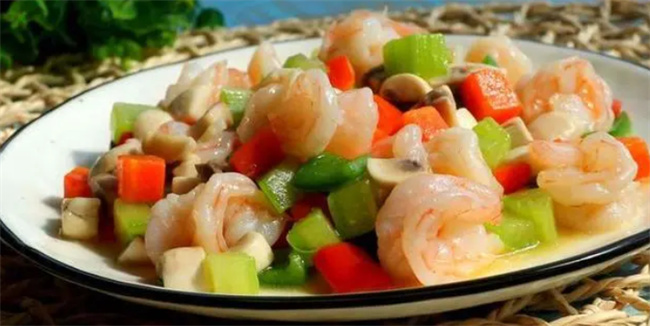 一、五色虾仁 食材: 虾仁、胡萝卜、莴笋、青红椒 制作方法: 1. 将胡萝卜、莴笋、蘑菇、青红椒处理好,切成小丁备用。 2. 清洗虾仁,去头去壳,剖开背部,去掉虾线。 3. 将蔬菜丁放入开水中焯水,随后捞出备用。 4. 虾仁也放入沸水中焯水,变色后捞出。 5. 热锅加油,下入蒜末,煸炒香,加入蔬菜丁炒匀。 6. 加入虾仁、盐和白胡椒粉,炒匀后淋入少许清水。 7. 煮沸后加入水淀粉溶液勾芡,至浓稠即可关火。