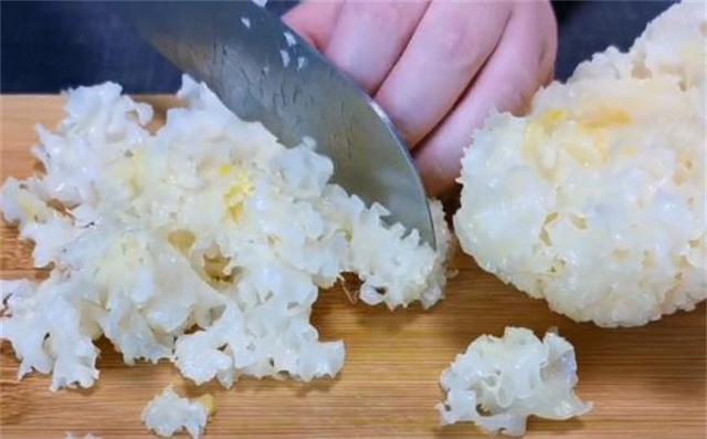 4.去掉银耳底部的黄色根部,将其切成小块。如果觉得麻烦,也可以直接用手将银耳撕成小朵。