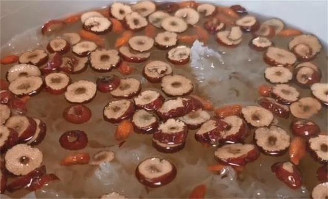 5.银耳切好后,放入3升清水中,盖上盖子,用大火煮沸。因为我们在泡发时加入了白醋,所以银耳会很快出胶。当银耳汤煮沸后,加入一些干的桂圆肉、一把红枣干、一小点枸杞和一些冰糖以增加甜味。所有食材放好后,转成大火煮20分钟即可。通常在家里炖煮冰糖银耳汤需要炖煮一两个小时,但现在只需在泡发时加入一些白醋,就能大大缩短煮制时间。