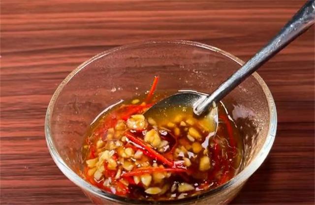 7.这时候我们来调个味汁,在碗中加入蒜末和红椒丝,然后浇上滚油,释放香气。加入适量的味精、白糖和芥末,一大勺蒸鱼豉油,少许陈醋,以及适量的芝麻香油,最后加入一勺冷开水,用勺子搅拌均匀。(www.ws46.com)
