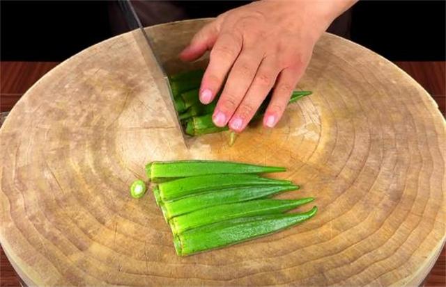 2.许多人在做白灼秋葵时第一步就错了,他们喜欢先切去头部,再从中间切开后再焯水。实际上,这种做法是错误的。正确的做法应该是只需要切前面一点点就可以,这样我们就可以达到整个的去给它焯水,因为秋葵中含有丰富的果胶和黏蛋白,这样焯水的话营养就不会流失,全部切好后给它放入盘中。