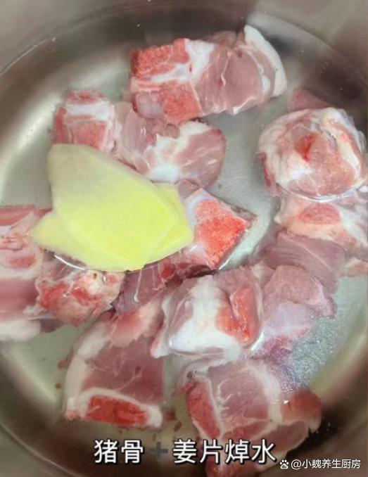 4:将猪骨剁成猪骨块,用冷水浸泡一会儿,汤锅放入一些猪骨,加上葱姜和料酒,一定记得要冷水下锅,焯水去掉腥味,准备处理好的猪骨和几种食材,开始制作这道马蹄胡萝卜玉米炖猪骨汤。