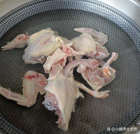 第四步:准备好一个炖锅,锅中放入鸽子肉,放入一些生姜片,加入冷水下锅,鸽子肉焯水去腥,冲洗掉浮沫,准备好鸽子肉和其他食材,开始制作这道山药赤小豆绿豆鸽子汤。
