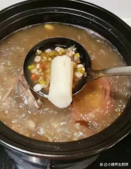 第六步:先大火炖煮,然后小火煲一个小时,放入一些新鲜山药炖煮,让一些食材都煮烂。 第七步:调入适量食盐调味,出锅前加上胡椒粉和其他调味品,焖煮一小会儿,出锅,这款山药赤小豆绿豆鸽子汤就可以食用了。