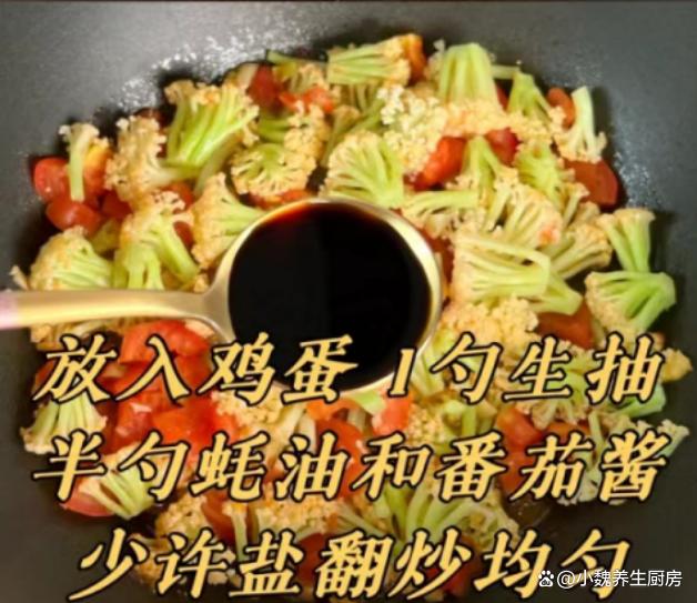 第七步:倒入花菜炒至断生,最后倒入提前炒好的鸡蛋块,加入一勺生抽,加上半勺蚝油,加上一勺番茄酱,加上食盐,鸡精和胡椒粉调味。
