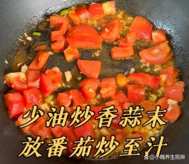 第六步:锅中继续加上油,放入葱花和蒜末,快速煸炒一会儿,倒入一些番茄丁煸炒出汁水,用锅铲按压一下。