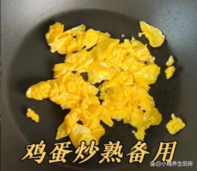第五步:锅中烧热预热,调入适量食用油,蛋液倒入锅中,让蛋液快速凝固成块,用锅铲翻炒成小块,炒熟后盛出、