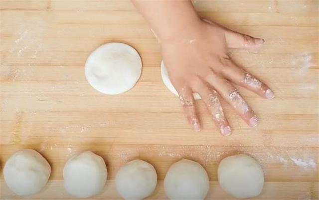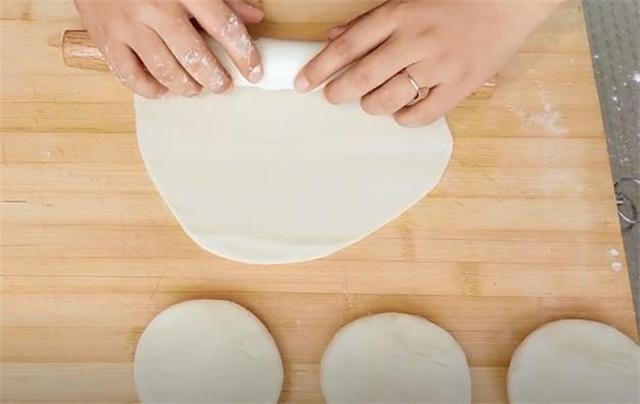 4.取其中一个剂子,表面刷一层油,注意外边缘不要刷,然后再把另一个没有刷油的饼胚覆盖上去,擀压成饼皮。