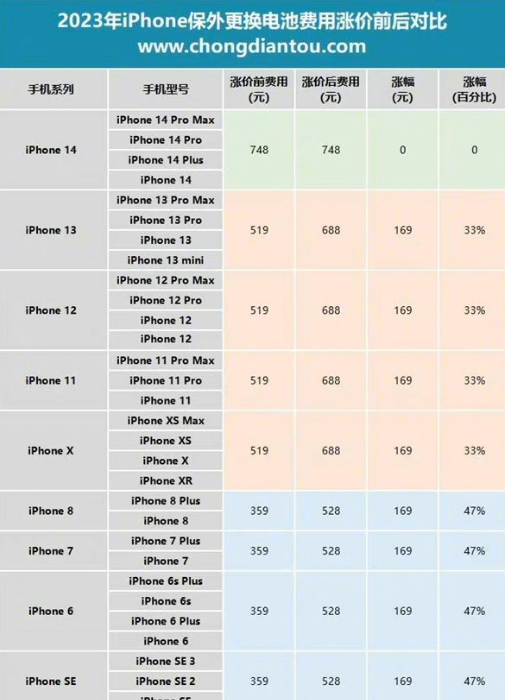 iPhone换电池涨价了多少2023从明天也就是3月1号开始,苹果iPhone等设备全系电池将涨价,你们找苹果官方换电池出的钱更多了。举个例子iPhone6/7/8系列以前换电池只要359元,涨价后需要528元;iPhone X/11/12/13系列以前只要519元,涨价后要688元,价格普遍涨了169元,涨幅最高达47%。讲真,这价格你们会换吗?