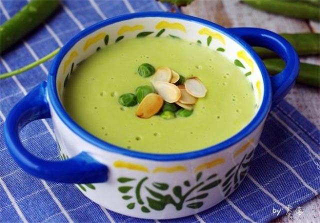 豌豆浓汤——醇厚与清新的完美结合! 将鲜豌豆粒加入浓汤,不仅能为汤汁增加一丝清新感,还能使汤汁看起来更加丰富。一幅豌豆浓汤的画卷,正在你的眼前展开。