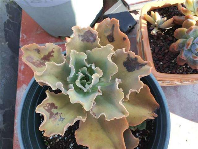 3、黑斑 由于高温和空气流通不畅,多肉植株接触到泥土的地方,很容易发黑发霉。 而一旦有了黑色斑点,那就说明寿命已经所剩无几,若是不能在短时间内弥补,那么很有可能会留下遗憾。 所以,在日常生活中一定要注意,如果发现自己的根颈出现了腐烂式黑斑,一定要及时的处理。