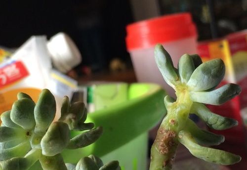 1、化水 多肉化作液体,这个过程很痛苦,也很无奈。最多两三天,叶子就会起水泡了,尤其是大热天,如果有融化的征兆,那就更要注意了。 如果叶子已经被水浸湿了,要果断地将叶子剪断,将水浸湿的叶子四周的叶子全部剪除,并严格消毒。 再挑几片比较结实的叶片,留作备用。只要一个叶片化水,整个多肉都会化水,没有一丝一毫的可能能救活它,而前面做的工作,只是在等待一个奇迹。