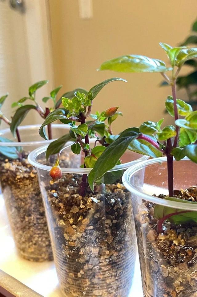 把健壮的枝条剪下来,保留两片叶子,叶片修剪到一半,晾干伤口之后,插入透气性好的沙土中,期间保持土壤湿润,注意遮光,注意通风,大概三周可生根发芽。今年成扦插成活,来年便可以开花了。 倒挂金钟