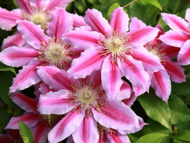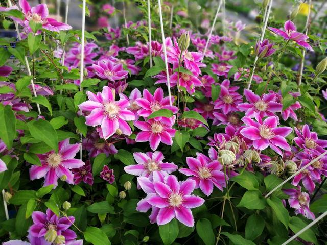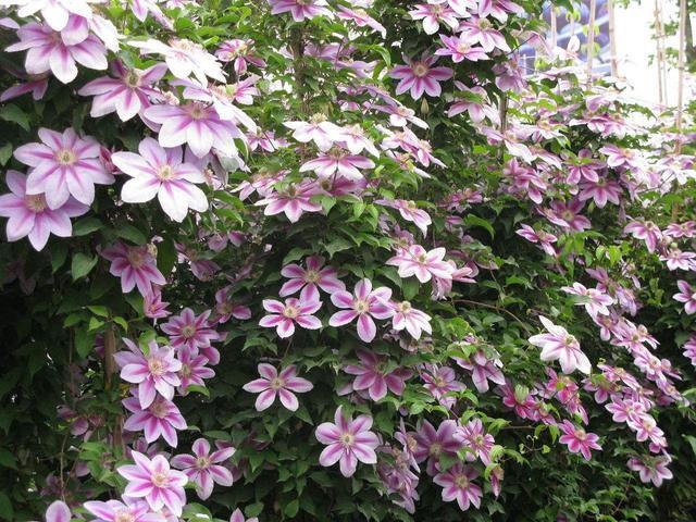 不管是在自己的小院,还是在阳台或者是露台上,都能见到一株株铁线莲的身影。 铁线莲有很多种颜色,也就是说,只要有一株,在花园里,都能开出五彩缤纷,层层叠叠,千姿百态,几乎和宣传照上的一模一样。 铁线莲种类繁多,形态各异,大小不一。最小的花3厘米,最大的花28厘米。不要小看这几朵花,这几朵花的体积可不小,你有没有看到那几朵花的瀑布?