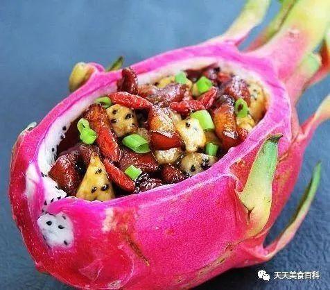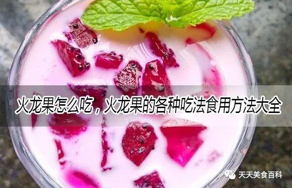 二、火龙果怎么吃 1、榨汁喝。将火龙果去皮,切成小块或小丁,放入榨汁机中,可以留少许做好后放在果汁上面;榨汁机中加入白糖和开水;启动榨汁机,停止工作后倒出果汁,把小丁加入果汁中就可以了。 2、做沙拉。火龙果可以和很多水果一起吃,做成沙拉酱是不错的选择。具体做法:将火龙果去皮,切小块,一口食用的大小为宜,和其他水果或蔬菜放在容器里,加入适量的沙拉酱,搅拌均匀即可。 3、蘸蜂蜜食用。火龙果有点涩味,食用时切开火龙果,用勺子淋上蜂蜜挖着吃,就可以去掉涩味,或者舀出火龙果的果肉,用蜂蜜搅拌了食用也不错。 4、炸火龙果。将火龙过果肉切成厚片;把面粉、生粉、泡打粉用水搅拌成糊状,将火龙果片放入10分钟备用。在锅里放油烧沸,将裹了粉的火龙果片放入油中,外面发黄捞起即可。