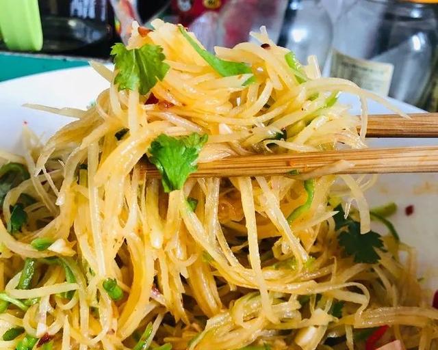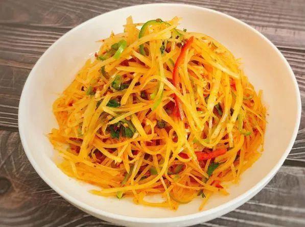 5、炒土豆丝的时候,要在烧油时先放一点蒜,待到油热后,在土豆下锅的同时酱油醋也要跟着下锅,用大火翻炒,再倒点料酒、放盐味精糖,随即出锅。这样,放了醋的土豆不加水翻炒,也不用担心粘锅。 四、要做好凉拌土豆丝,需注意这几点: 1、土豆丝焯水前,要先将淀粉去掉,放清水里浸泡一段时间,这样土豆丝表面没有淀粉,会更加脆爽; 2、土豆丝焯水时,加少许食盐和白醋,食盐可以增加底味,土豆丝有味道更好吃,白醋可以让土豆丝更爽脆; 3、土豆丝焯水时间不能太长,只要断生就可以了,时间太长,土豆丝不脆爽。 五、在家制作凉拌土豆丝的窍门技巧: 1、土豆丝直接下锅焯水是不对的,土豆提前放在清水中浸泡一会,去除其表面的淀粉,口感更好; 2、土豆丝、胡萝卜丝想要保证清脆爽,焯水时间不宜过长,大概1分钟左右就可以了; 3、焯过水的土豆丝过一遍凉水,更加清脆。 |