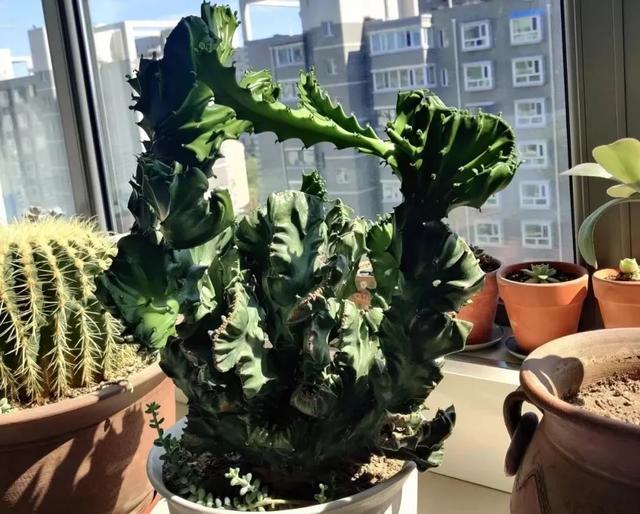 玉麒麟是一种多肉植物,它的叶肉上有凹凸不平的凸起,生长不规则,千变万化,就像上古神兽,故名为玉麒麟,代表的是吉祥,可以镇宅保平安。同时,还可以改善空气质量,制造氧气,使人健康。 玉麒麟外表看起来比较丑陋,其貌不扬,但的深受大家的喜爱,搭配一个精致的花盆或者小摆件,可以提升档次,显得端庄又贵气。