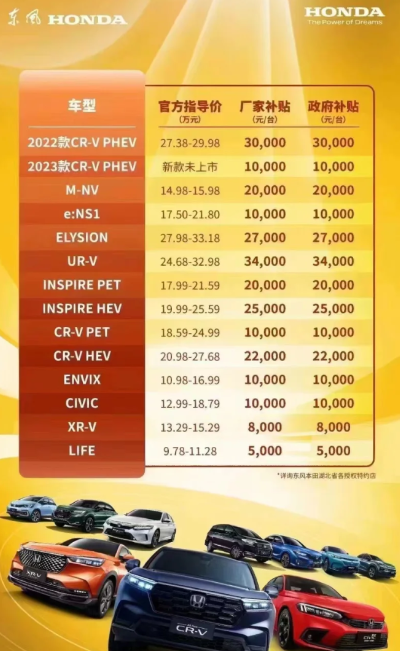湖北东风本田优惠2023多少刚刚踏入三月,汽车市场就掀起一场降价优惠热潮,湖北这波购车补贴来得有点猛,湖北省政府联合东风本田推出购车优惠政策,最高优惠6.8万,最低也有1万的优惠。 东风本田UR-V车型厂家优惠3.4万,政府补贴3.4万,合共优惠6.8万,相当于打七点折了。以前都是加价卖的 CR-V,现在22款的CR-V PHEV版车型合共优惠6万,另外艾力绅最高优惠5.4万,英仕派最高优惠5万,这波优惠来得有点猛烈。 湖北省政府和东风本田推出购车优惠政策之后,包括东风雪铁龙、东风标致、东风风神、东风日产、一汽丰田等品牌也参与了这场购车优惠热潮,力度之大,让人惊呆,最高优惠达9万元。