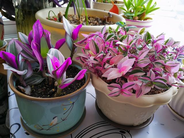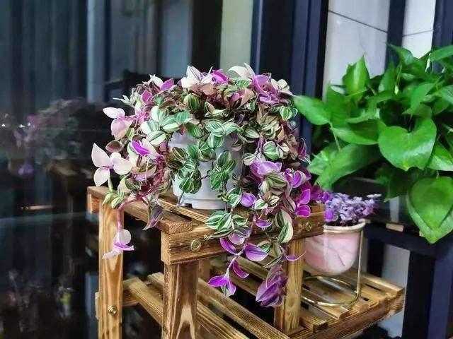 2、几盆油画吊兰 我买了不少盆栽,但是没有一个是适合挂起来的,现在就剩一盆,挂在阳台上,不得不说,这油画吊兰确实挺好看的,只是我不打算剪了,自己留着也挺好的。 每天在阳台上,无意间就能看到那些紫色和绿色交织在一起的树叶,很有特色,看了好几年也不会厌倦。 油画吊兰喜光,以往挂在花丛中,光线不足,难以发挥出最大的作用,而现在,挂画吊兰却像是换了一种新的植物,长得非常茂盛,偶尔还需要修剪一下。