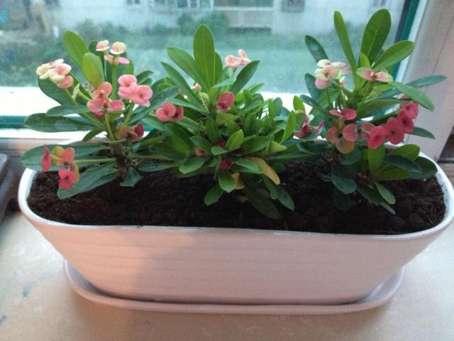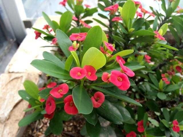4、一盆虎刺梅 我养的这株虎刺梅,从来没有换过土壤,看上去枝繁叶茂,可实际上,它还没有长大。 在一个小盆栽中,它的成长受限,但花儿却丝毫不减,一朵接一朵,绽放的花儿竟然比那只小木槿还要多。 虎刺梅四季常青,需要大量的营养,所以每月一次的施肥是最好的,如果没有特别的条件,可以在花盆表面开一个小洞,撒一些有机肥。
