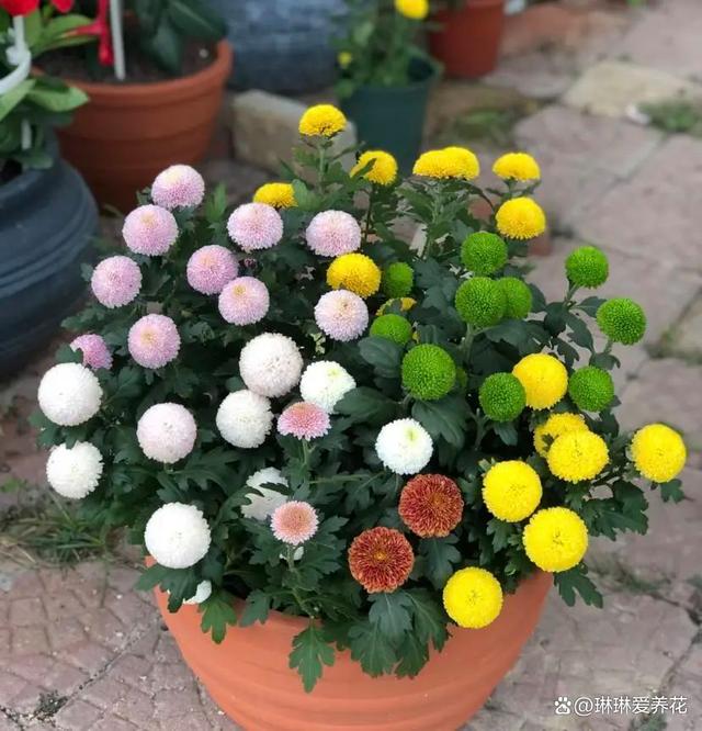 商家为了增加观赏效果,一个花盆里会种植4个品种,之所以能开出4种花色,是因为4个品种,而并非一个品种能开出4种花色,后期经过一段时间的养护,大家可以进行修剪扦插,乒乓菊的扦插成活率很高,把开完的残花枝条剪下来,插到土里就可以发根。