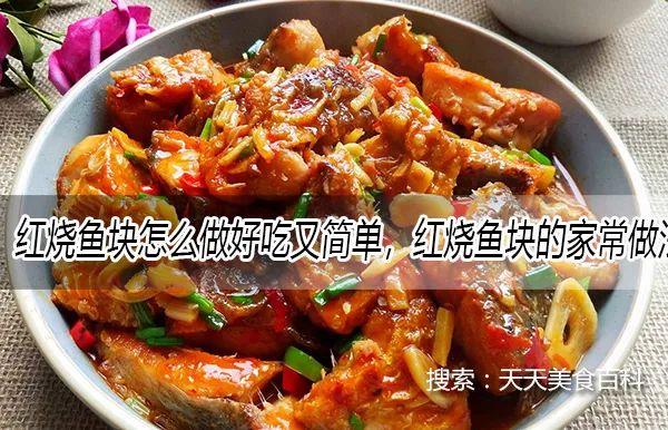 5、放红烧汁(老抽也一样,根据自己的口味,放的量多少主要就是最后的色泽)、糖(红烧汁本身就是调好的,根据个人口味,糖也可以不放,如果用的是老抽则一定要放糖),少许盐,轻轻晃动锅子,也可用锅铲略微翻动一下。 6、加水,煮至收汁,撒上少许葱花即可。 做法二、简单家常红烧鱼怎么做原 材料:鲜鲤鱼一条,葱姜蒜适量,干辣椒适量,豆瓣酱适量,生抽适量,老抽适量,料酒适量,白糖适量,清水适量 1. 将鲤鱼去鳞去掉内脏,清洗干净,斜切成两块备用。 2. 油热后,放入鱼块小火煎至金黄色捞出备用。 3. 锅中留少许油加入葱姜蒜和干辣椒炒香。 4. 加入豆瓣酱和适量的清水煮开。 5. 加入煎好的鱼块,加入适量的生抽,老抽和料酒,拌匀。 6. 加入适量的白糖,慢火焖煮十分钟即可。 7. 出锅前再装饰上一些葱花即可。 三、红烧鱼块的小诀窍 1、个人喜好不喜欢老抽生抽的味道,难吃。 2、喜欢用老醋 海鲜酱上色提味儿 苹果醋后放味道更香浓。