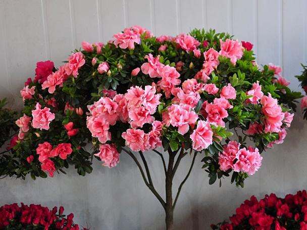 8、杜鹃花 杜鹃花,也被称为映山红,是一种深受中国人欢迎的盆景,有很多种类,有兴旺吉祥、事业兴旺、鸿运高照、坚强乐观等寓意, 植株优美,枝叶茂盛,叶片翠绿,开花时绚丽多姿,色彩鲜艳,花姿绰约,具有很高的欣赏价值。