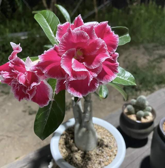 听说沙漠玫瑰是一种长在沙漠周围的植物,它的枝干粗壮膨大,花朵艳而不俗,高雅有魅力,观赏价值非常高,是当下最受欢迎的观赏花卉之一。 沙漠玫瑰的生命力比较旺盛,可以较好的抵抗不良的外界环境,非常难出现病虫害,而且比较耐旱,浇水过于频繁,容易引起根系腐烂,对于生长不利。除此之外,多晒太阳,多通风。 第二种,三角梅