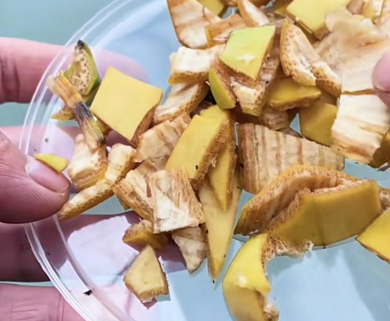 骨头放到蒸锅里,蒸一蒸,煮一煮,把上面残留的筋肉和脂肪去除之后,放在阳光下暴晒,晒上一周左右,然后用锤子或者破壁机打成粉,扔到盆里,就是花肥,养花太好使。 香蕉皮