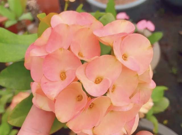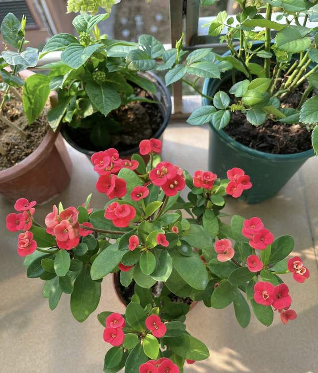 虎刺梅是一灌木植物,也叫铁海棠,它的典型特点是枝条上布满小刺,花朵像梅花,颜色有粉色,有橘色,黄色,白色,粉色等等,花朵小而精致,却也能呈现出一种花团锦簇的状态,适合点缀窗台,可以说是一种不错的装饰品。 虎刺梅的生命力特别旺盛,不容易发生病害和虫害,适应环境的能力很好,不论是在低温,高温还是干旱的情况下,不能存活,所以也是懒人和新手的首选。
