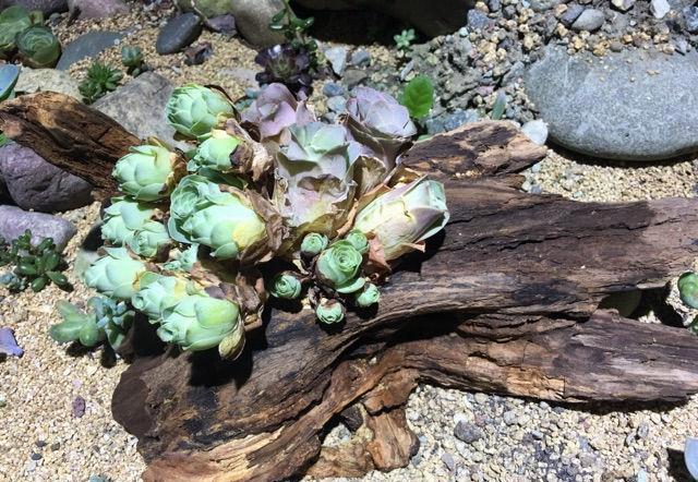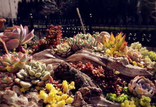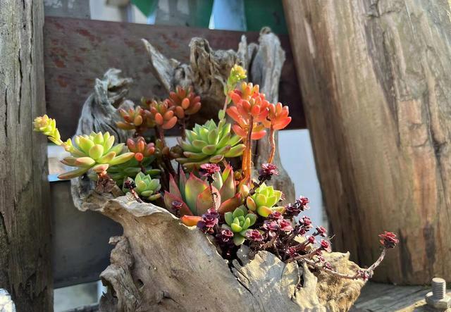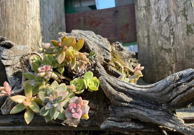 ④发挥想象 当然,“半根枯树”的作用不仅仅是这些,它还可以按照多肉的大小和颜色来组合,或者是将多肉移栽到各个区域,组成一个小型的森林。 这就是移栽之后的结果,刚开始的时候,看上去平平无奇,但只要多种植一些,多培养一些时间,就能让这两种植物,变得更加漂亮。