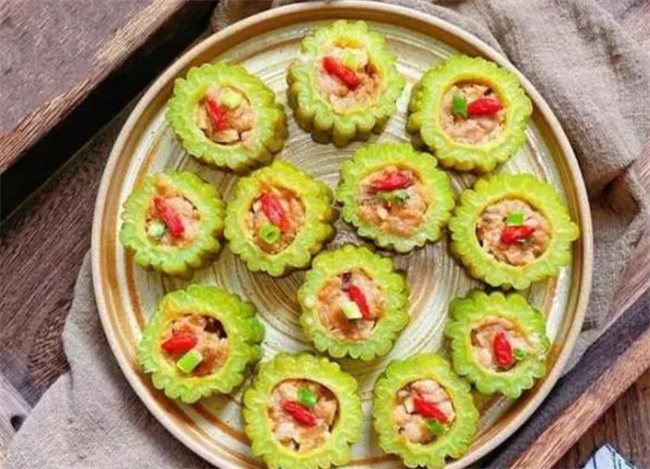 五、蒸苦瓜酿肉 1.将猪肉切成小块,放入料理机打成肉末,加入香菇碎和调料搅拌均匀。 2.将苦瓜去皮,切成小段,去掉内瓤。 3.在锅中加水煮开,加入少许盐和苦瓜煮半分钟后捞出。 4.将苦瓜凉下后,将肉馅填入苦瓜中,再入锅蒸十五分钟。 5.加入枸杞和葱花焖两分钟,取出即可食用。 |